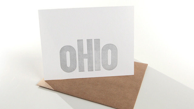 By the cool cats of Real Mart (of Dayton, OHIO), these sweet oHIo cards were letterpressed (in OHIO) with wood type and silver ink on 100% white cotton lettra paper. Ow ow!